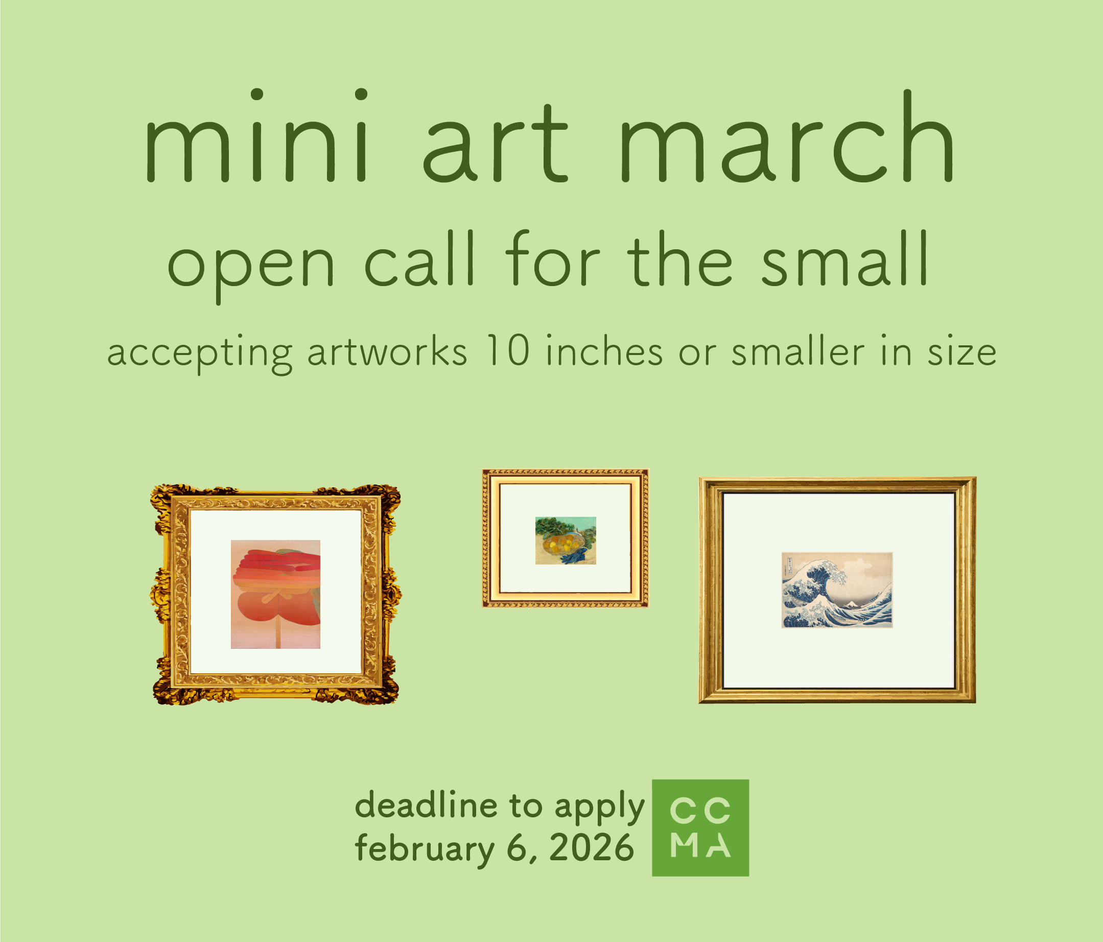 An open call for the small! The CMMA’s Wings and Techcetera Galleries is seeking paintings, drawings, collages, prints, and sculptures for mini art march. To apply, submit up to three pieces of artwork that are 10 inches or less in all directions. This exhibition will be on display for the month of March in 2026. All College of DuPage Students are eligible to apply.